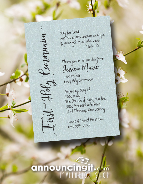 First Holy Communion Invitations printed on Shimmery aquamarein Blue paper and comes with coordinating shimmery white envelopes – these invitations are perfect for your child’s first holy communion invitations. Come see our entire first communion invitation collection for girls and boys at Announcingit.com
