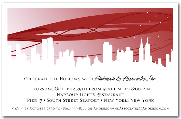 Ruby City Skyline Invitations are perfect for a holiday party invitation, Christmas party invitation, office holiday party, business holiday event invitation and more.